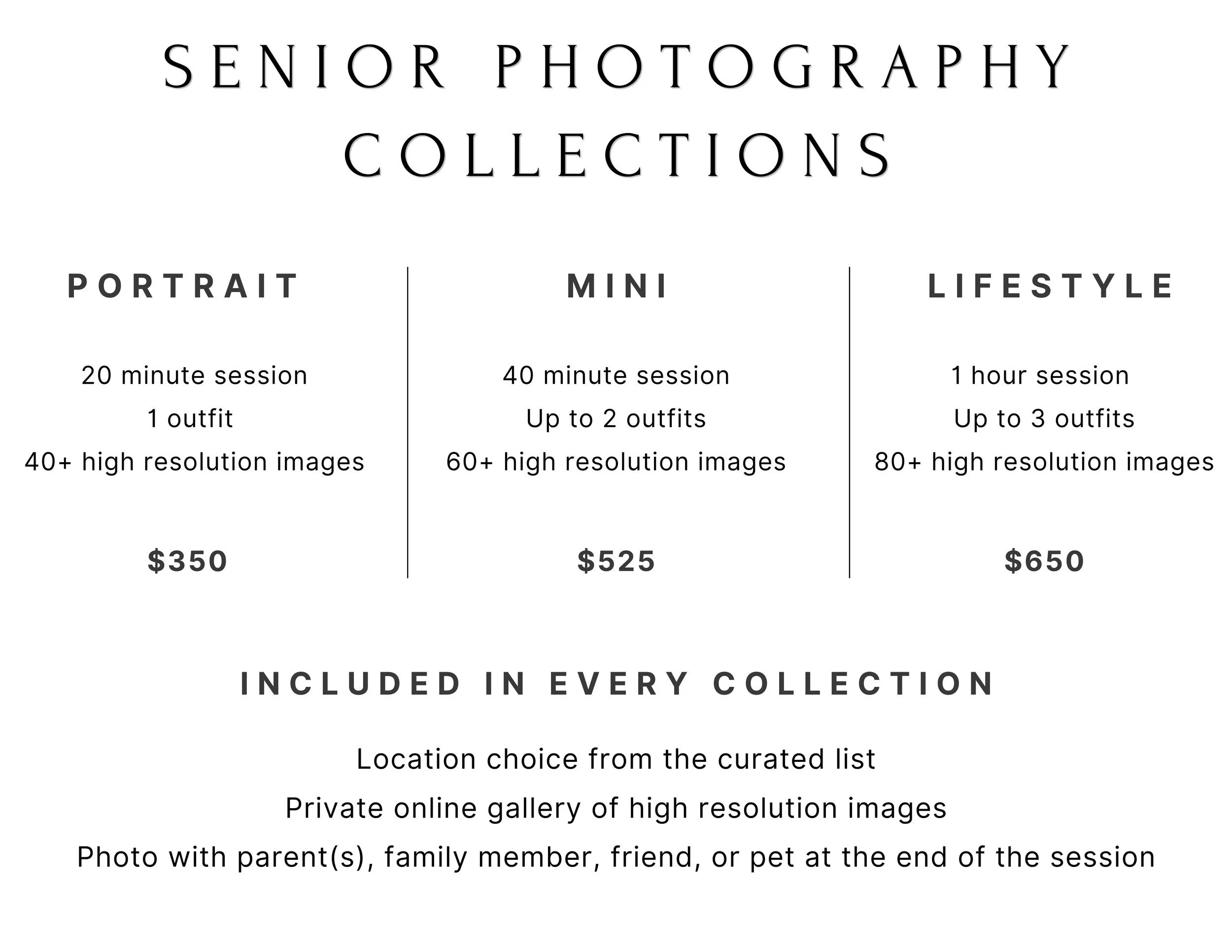 I feel very strongly about making sure that EVERY student is able to celebrate this amazing milestone with their own senior photography session. If the collection options aren’t in your price range please do not hesitate to reach out and we can customize a senior collection that best suits your budget.